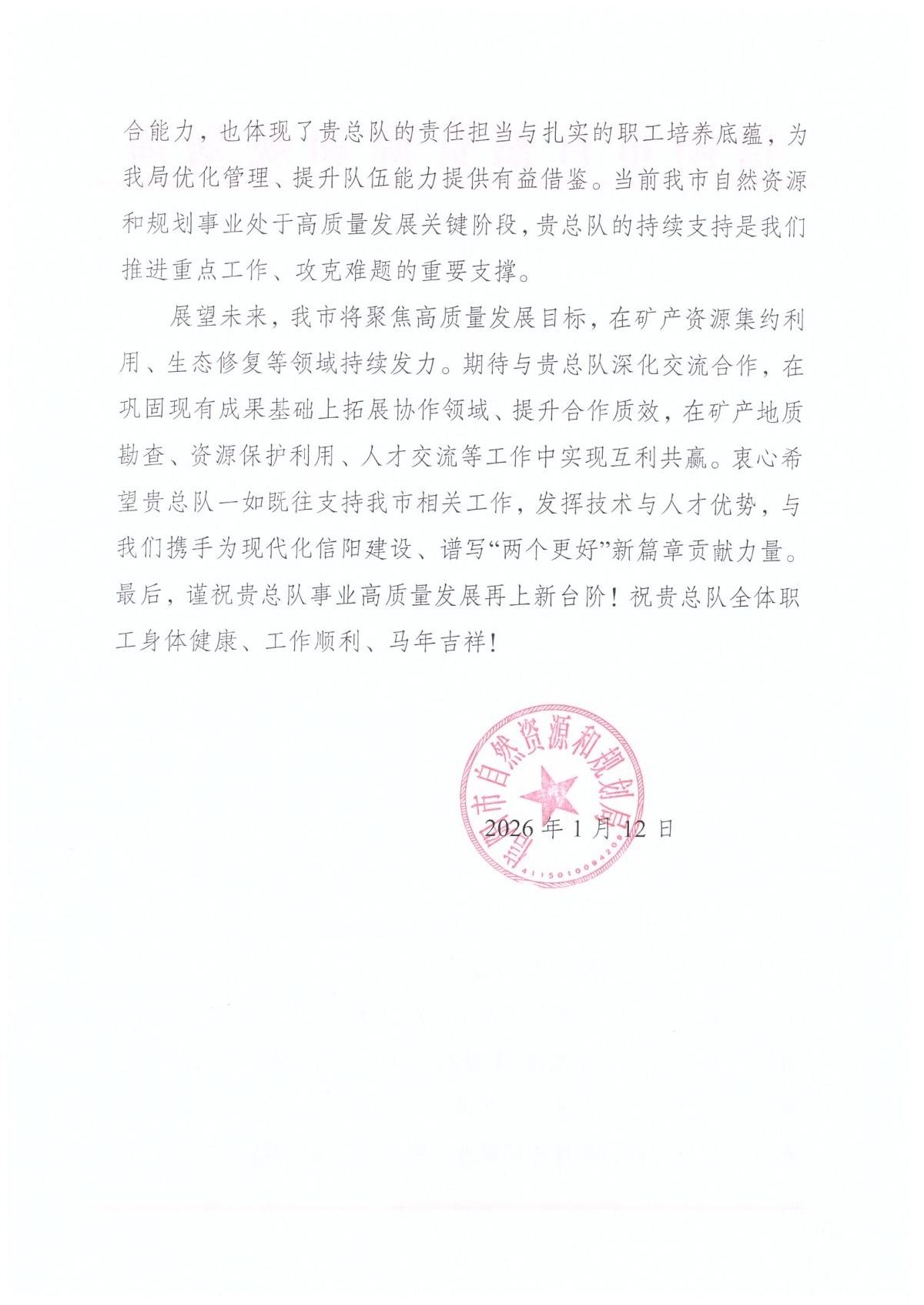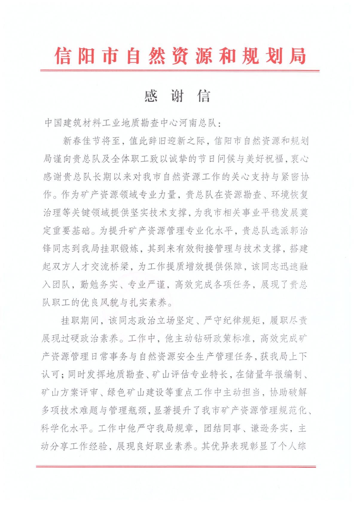 近日,我院收到信阳市自然资源和规划局发来的感谢信。信件满含认可与敬意,对我院长期以来为职能部门提供的地质技术支撑给予高度评价,尤其对我院派遣技术人员展现的责任担当、专业素养致以诚挚谢意,为全院干部职工带来强烈鼓舞。